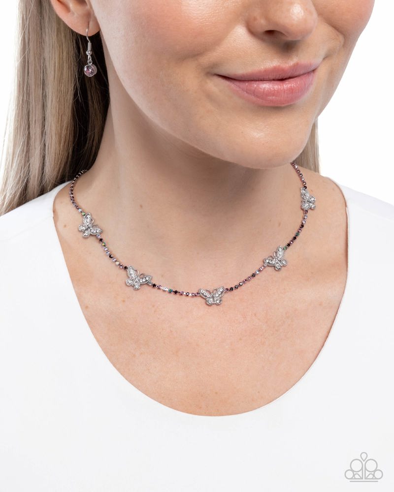 Infused along a row of dainty amethyst, violet iridescent, light amethyst, violet, and amethyst iridescent rhinestones pressed into silver box-chain settings, a collection of silver butterflies coalesces around the neckline for a whimsical finish. Each butterfly features a dainty shimmer of white rhinestones on its wings, for a sparkly statement. Features an adjustable clasp closure. Due to its prismatic palette, color may vary.