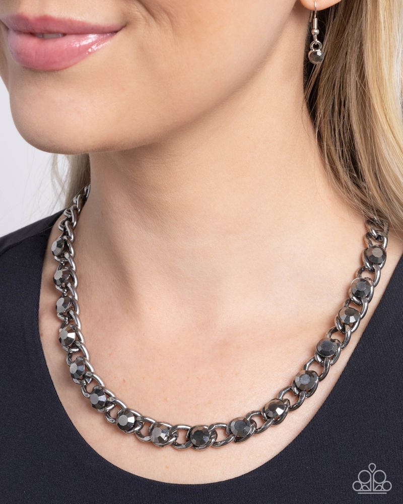 Oversized hematite rhinestones dot a row of oversized silver chain, resulting in a gritty glitz below the collar. Features an adjustable clasp closure.