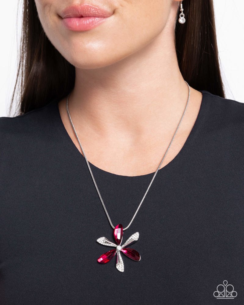 Featuring a white rhinestone center, an abstract silver flower with sheared pink gem petals that alternate with white rhinestone-dusted silver petals glides along a silver snake chain below the neckline for a whimsical, eye-catching look. Features an adjustable clasp closure.