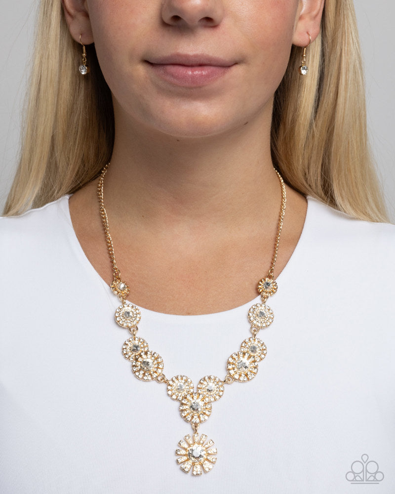 Clusters of glittering white rhinestones are pressed into round gold serrated frames, creating a radiant display along the neckline. A larger rhinestone-encrusted circle swings from the bottom, adding movement and additional sparkle to the design. Features an adjustable clasp closure.